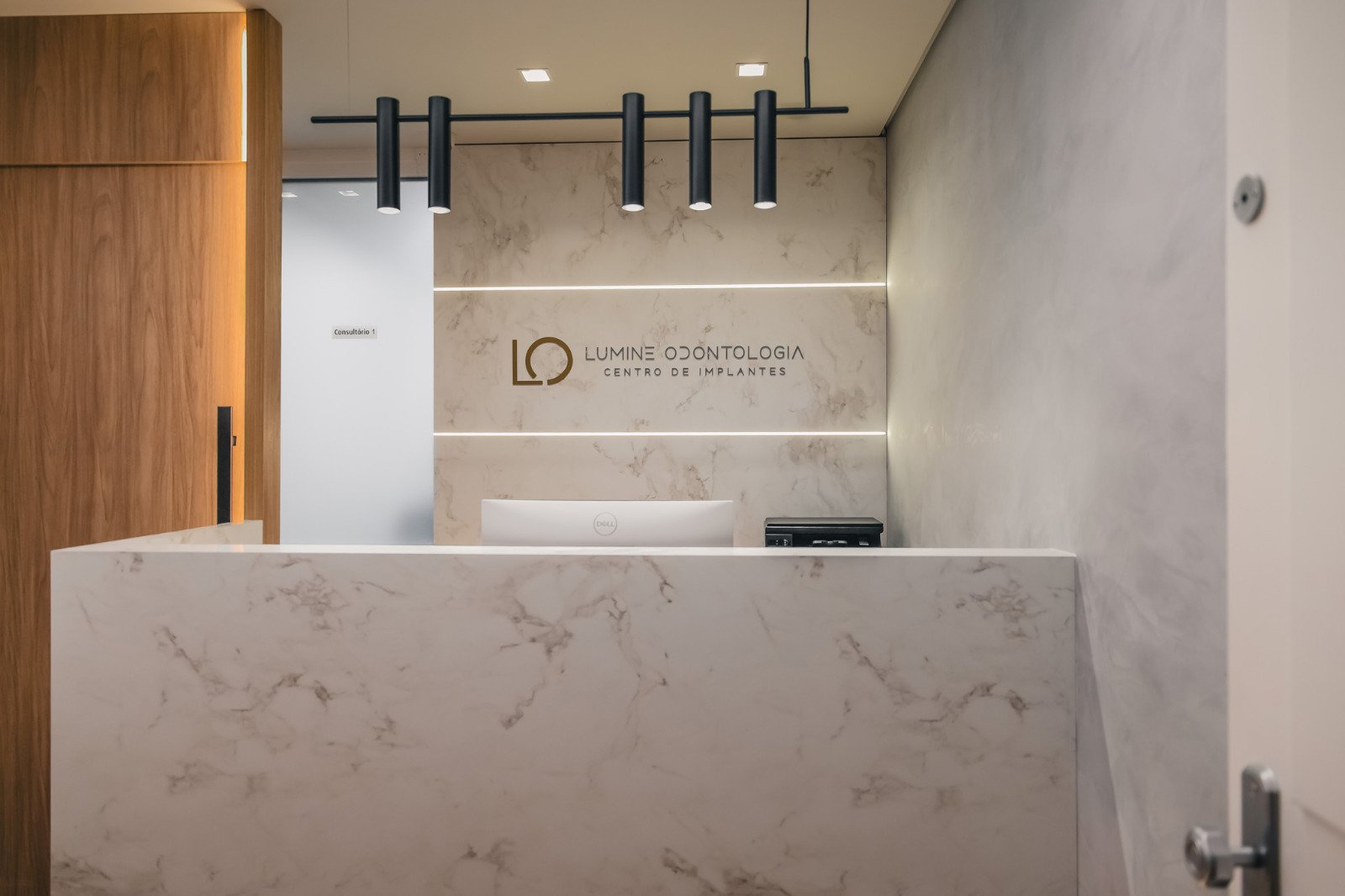 Balcão em mármore com iluminação projetada